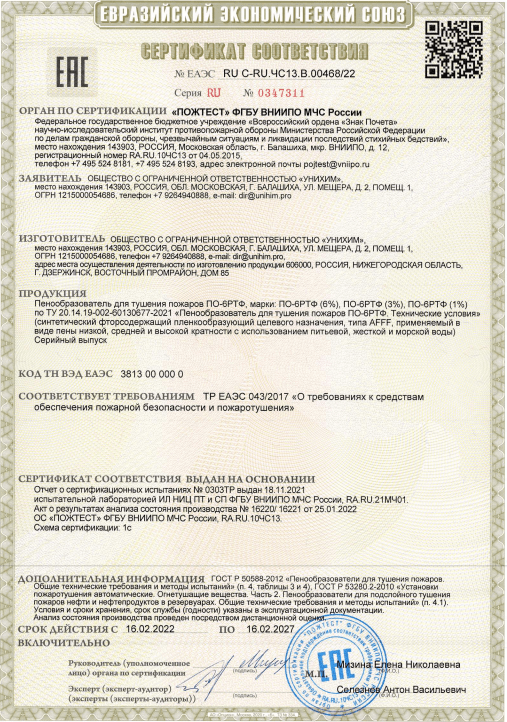 Пенообразователь для тушения пожаров ПО-6РТФ, марки: ПО-6РТФ (6%), ПО-6РТФ (3%), ПО-6РТФ (1%) по ТУ 20.14.19-002-60130677-2021 «Пенообразователь для тушения пожаров ПО-6РТФ. Технические условия» (синтетический фторсодержащий плёнкообразующий целевого назначения, типа AFFF, применяемый в виде пены низкой, средней и высокой кратности с использованием питьевой, жесткой и морской воды)