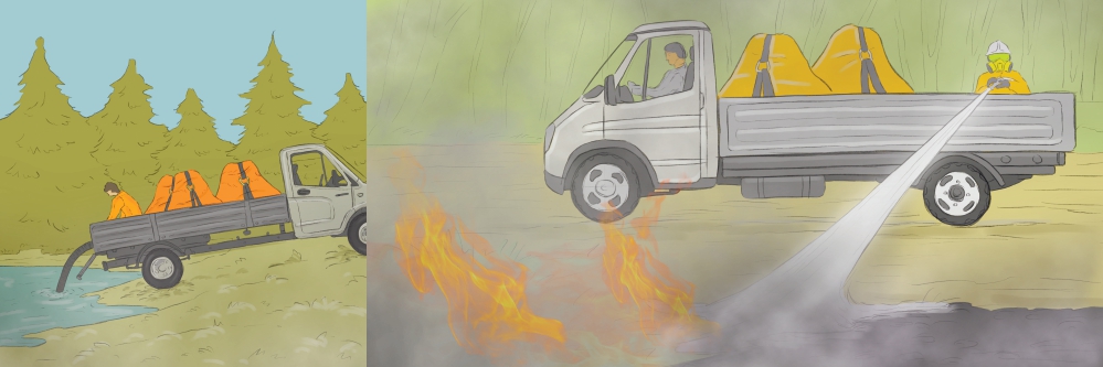 Соединенные между собой три цистерны и мотопомпу можно перевозить на автомобиле (прицепе) с размером кузова не менее 4x2 м. Это позволяет осуществлять эффективное длительное пожаротушение кромки огня природного пожара в движении при скорости до 10 км/ч.