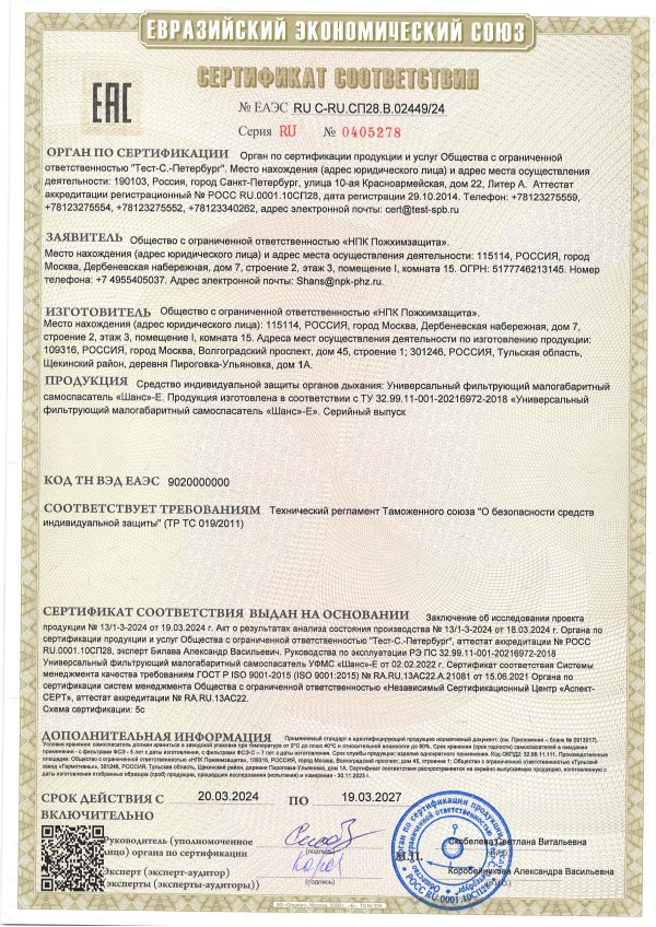 Самоспасатель УФМС «Шанс»-Е сертифицирован на соответствие следующим требованиям: